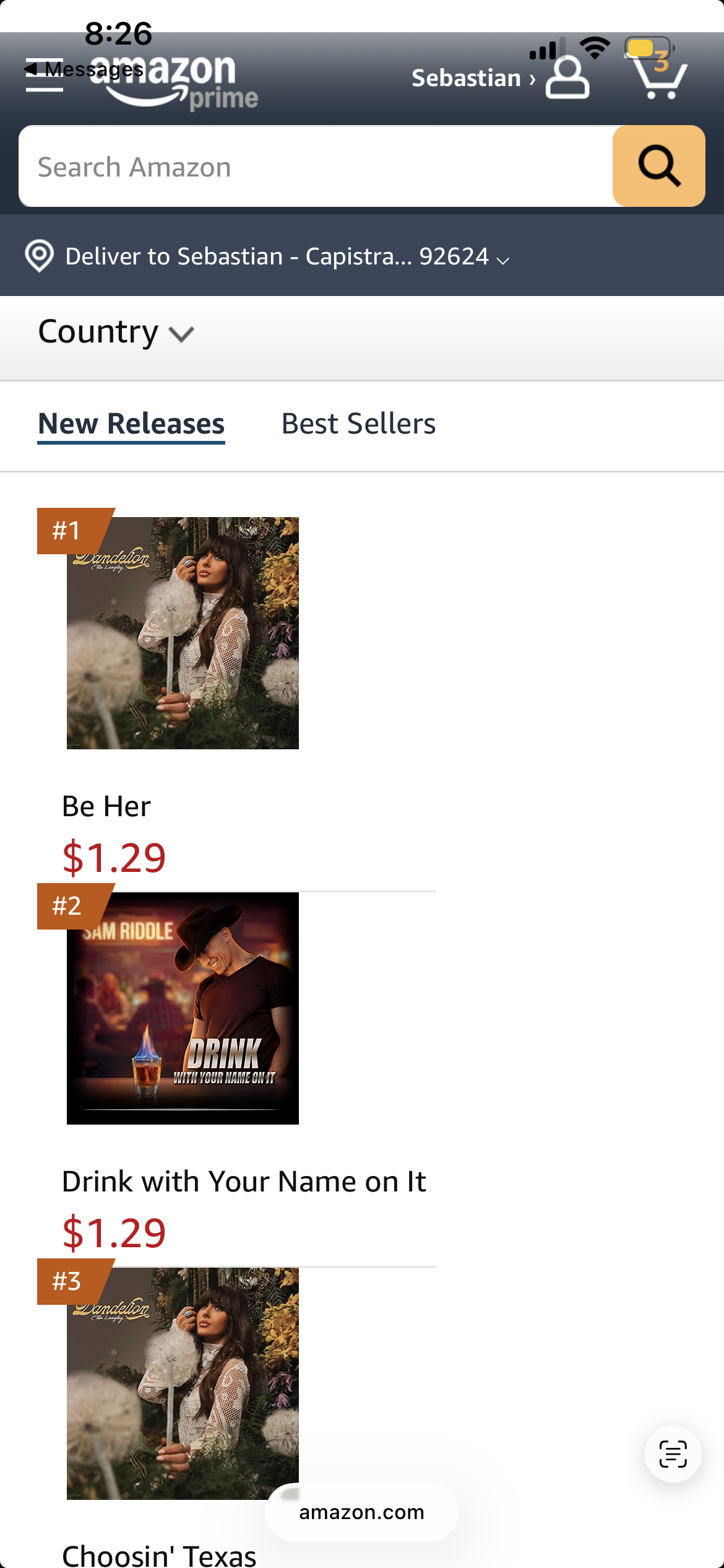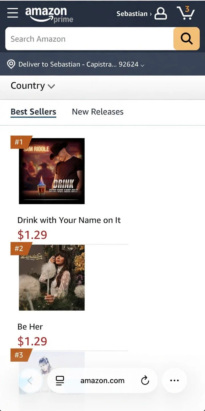 Country music artist Sam Riddle charts above Ella Langley “Dandelion” on Amazon Country Music with his single “Drink With Your Name On It” as number 1!